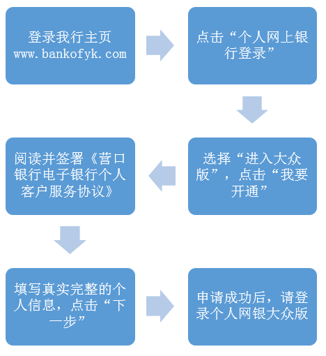 持有營口銀行卡或存折的客戶,可以通過任意一臺連接Internet的電腦登錄m.sccdh.com自助注冊營口銀行個人網(wǎng)上銀行大眾版,具體操作流程如下: